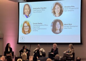 Following Tim Duy’s presentation, we had panelists Christine Pitts, with Open School Inc, Antionette Chandler, with Port of Portland, Connie Seeley, with Oregon Health & Science University, Michi Slick, with Killian Pacific talk more with moderator, Candace Beeke, with the Portland Business Journal. All the panelists agreed that there was equal parts uncertainty and hopefulness when it came to our new Portland local government and the federal changes upcoming in the next year. Each of their industries were advancing in some areas and seeing slower growth in other aspects. Two highlights being the ongoing OHSU merger with Legacy Health, which will bring much-needed care to Oregon patients, and the newly remodeled PDX terminal, which brought jobs and revenue back into the city. Overall, the sentiment shared by all was optimism about the path we will embark on together to move forward.