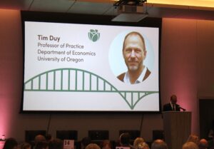 Featuring a presentation from Tim Duy, Professor of Practice at the University of Oregon, we heard about the rivers and valleys of the current and predicted economy and what we might expect next. Tim explained several trends and updates about the year ahead, including that we have a resilient consumer base, stock prices are up (as long as job growth continues), and the overall economic outlook is positively trending into 2025. We are headed into a soft landing, which Tim described as an equilibrium including 2% growth and 4% unemployment rates.